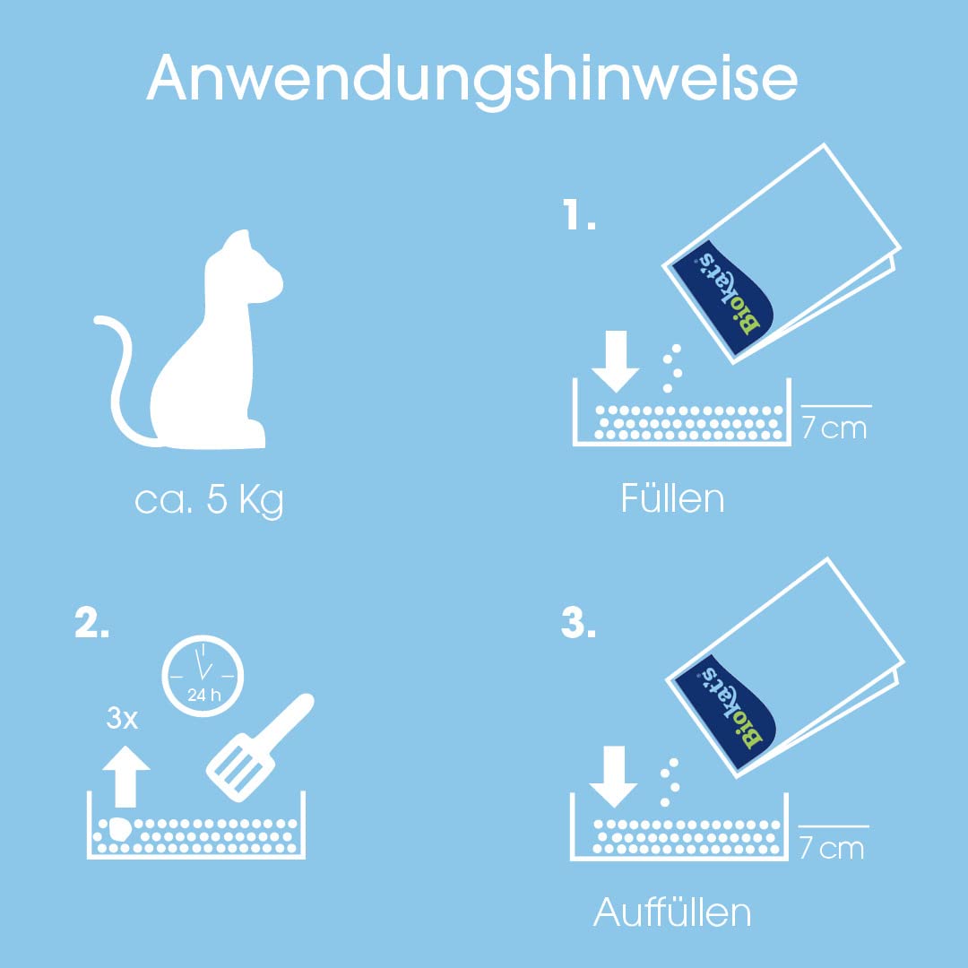 Empfohlene Füllhöhe 7cm. Entfernen Sie 3x täglich die Klumpen und festen Ausscheidungen. So bleibt die restliche, unbenutzte Streu länger frisch. Nachfüllen statt neu füllen: Nur die entnommene Menge wieder dazu geben.